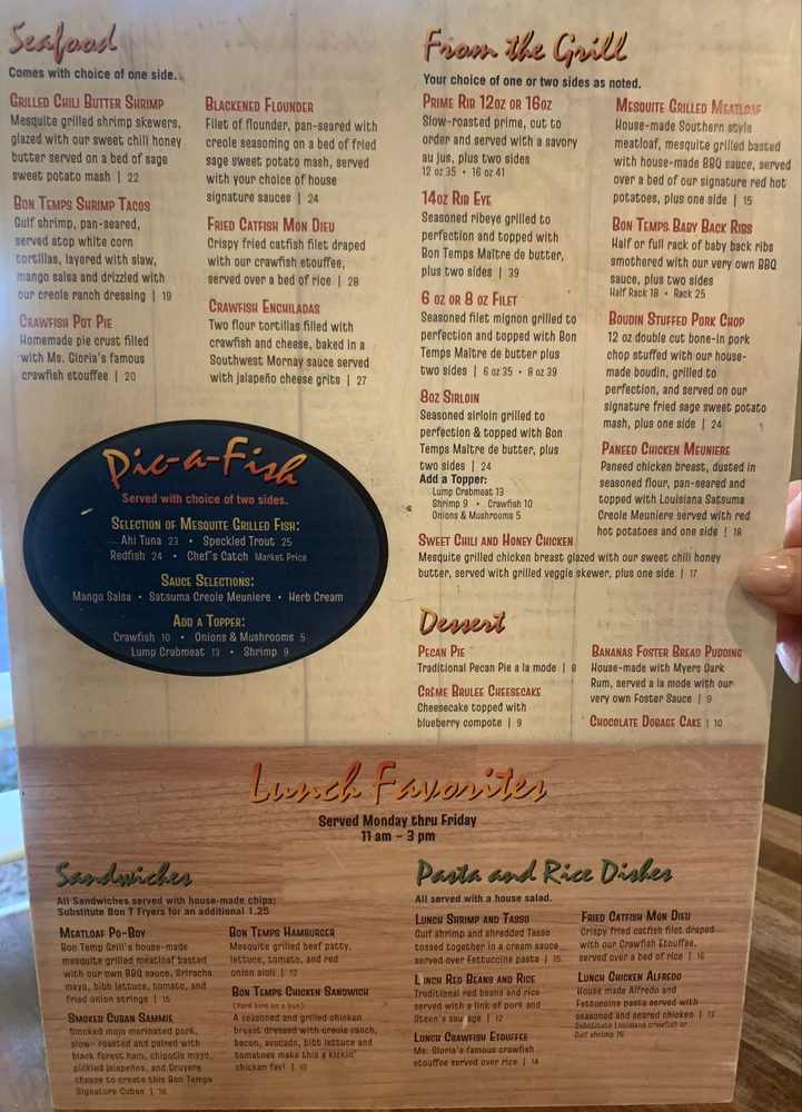 Seasoned filet mignon grilled to perfection and topped with Bon Temps Maitre de Butter. Served with your choice of (2) sides.